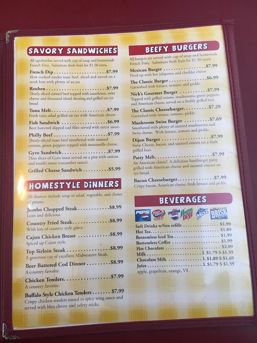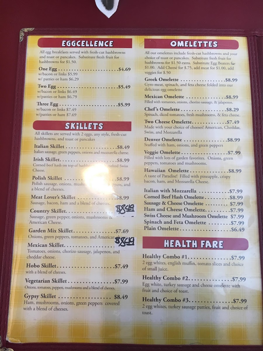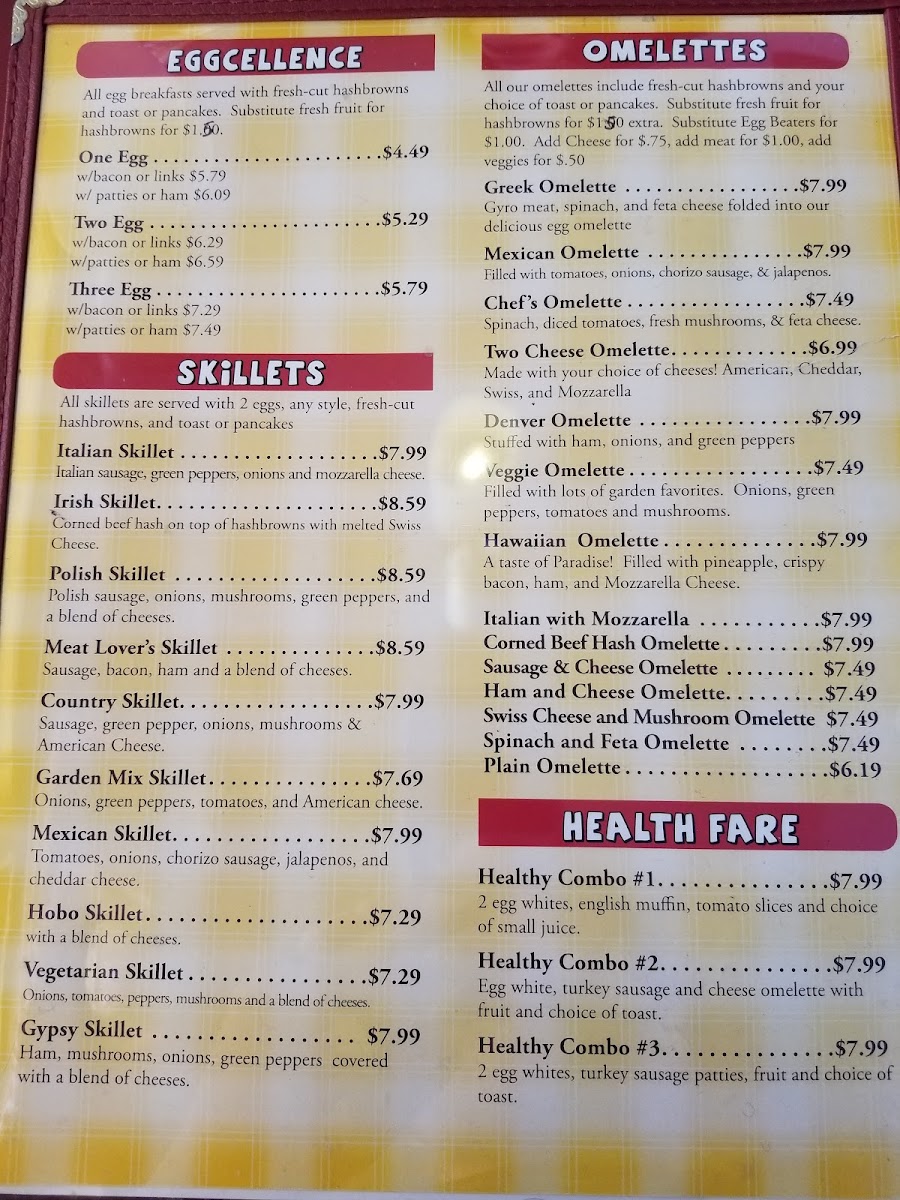 Two eggs prepared to preference: over easy, over hard, medium, scrambled, sunny-side up. Choice of side: pancakes, various toasts (white, wheat, rye, sourdough), English muffin, raisin, Texas.